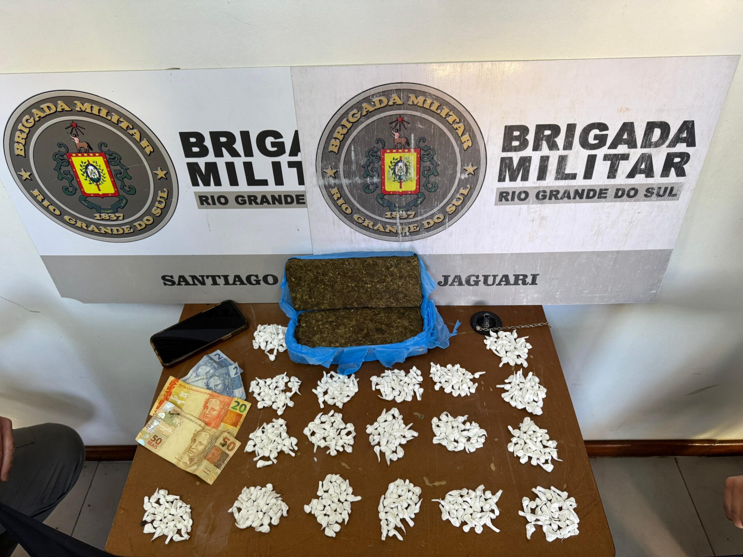 Em ato contínuo, os policiais realizaram buscas no local e localizaram dois tijolos de maconha, que totalizaram 983,04 gramas, além de 540 buchas de cocaína, somando 192,53 gramas. Também foram apreendidos R$ 74 e um aparelho celular, modelo iPhone 11.