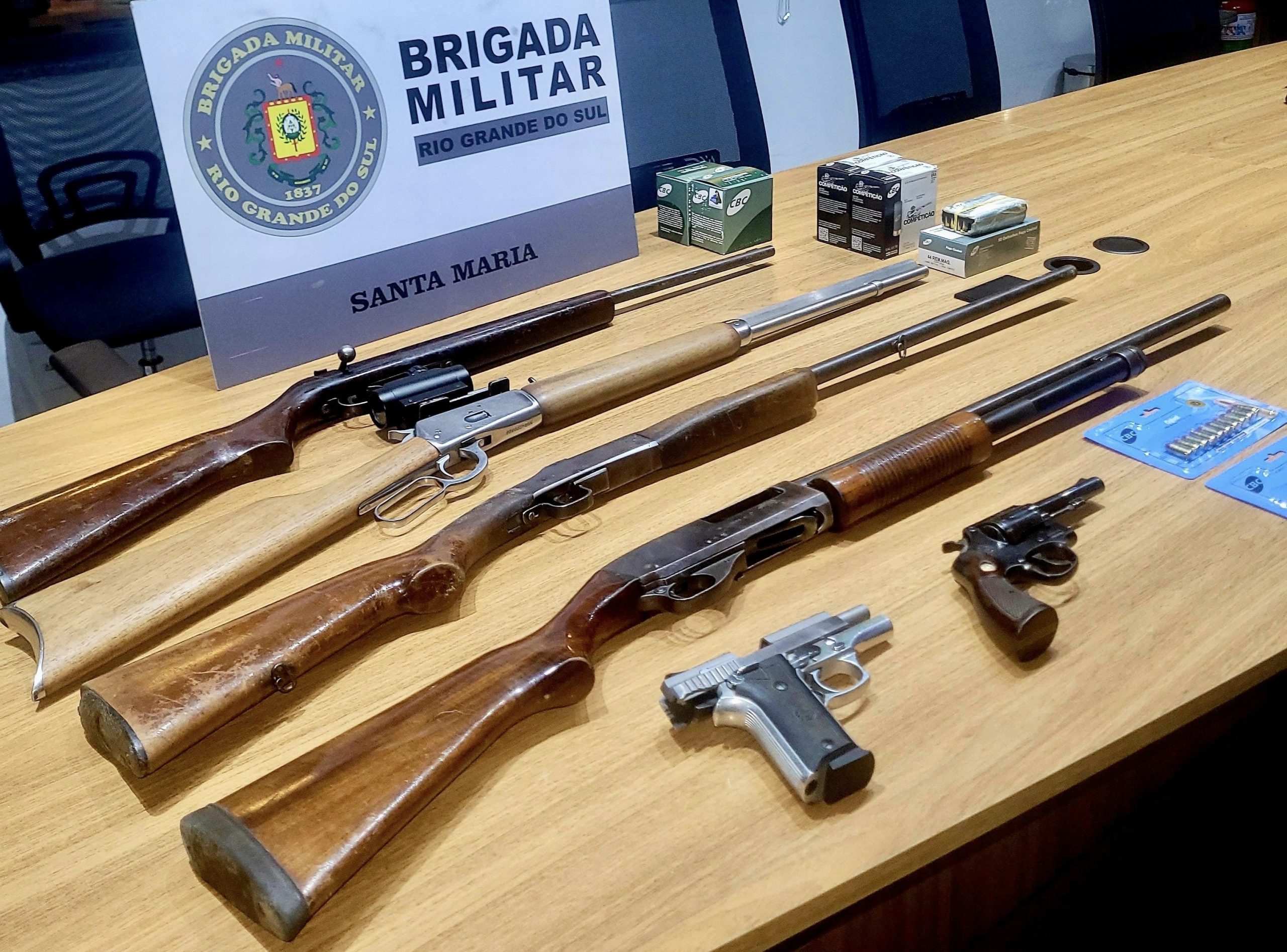 Entre o material apreendido estavam um revólver calibre 38, uma pistola calibre 380, além de espingardas calibres 12, 20, 22 e 44. Também foram recolhidas diversas munições de diferentes calibres.