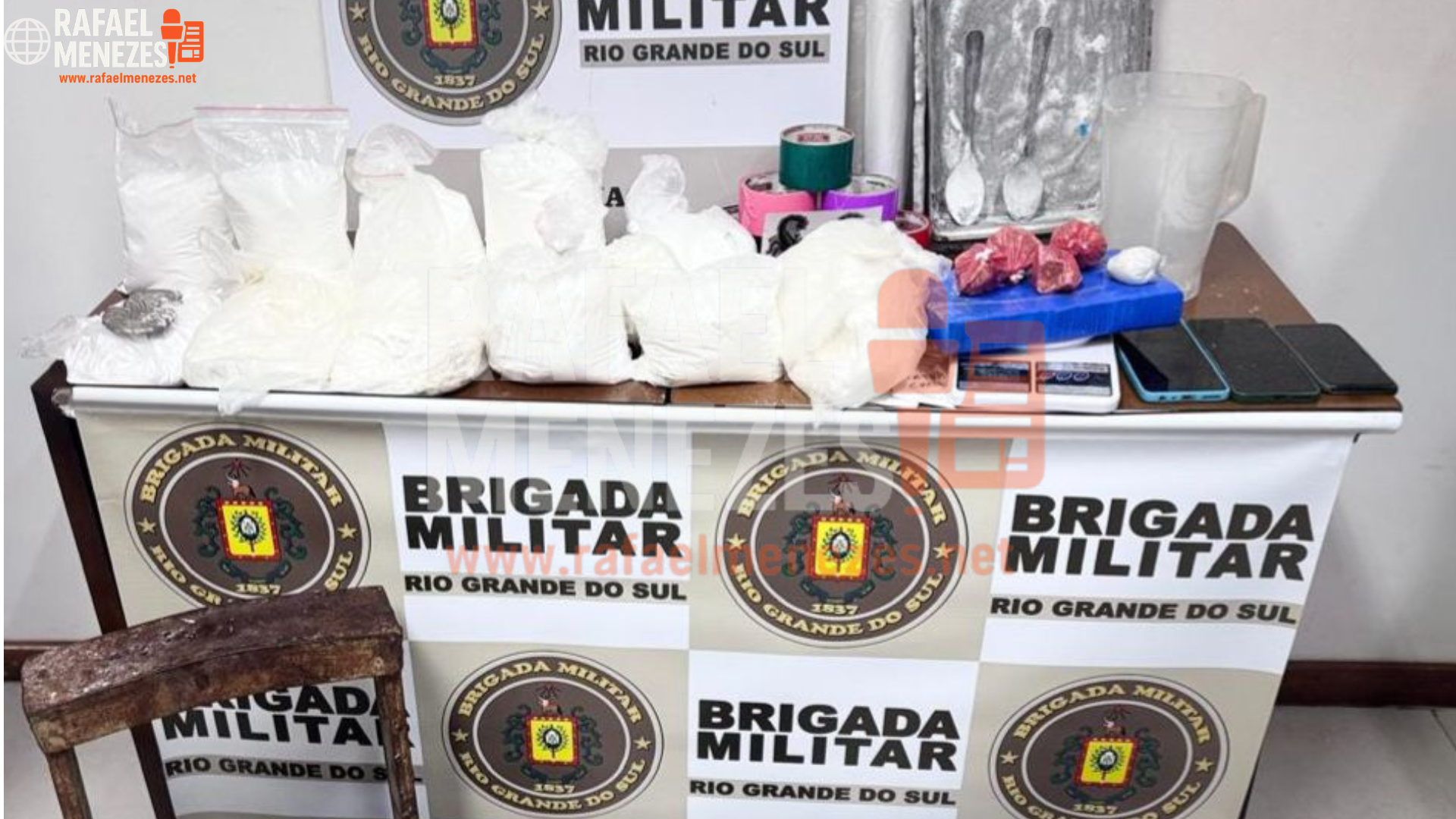 No local, foram apreendidos 11,110 kg de cocaína, 200,11 gramas de crack divididos em quatro porções, 11,78 gramas de cocaína tipo “escama”, 697,15 gramas de substância utilizada para mistura da droga, além de outros objetos relacionados ao tráfico.