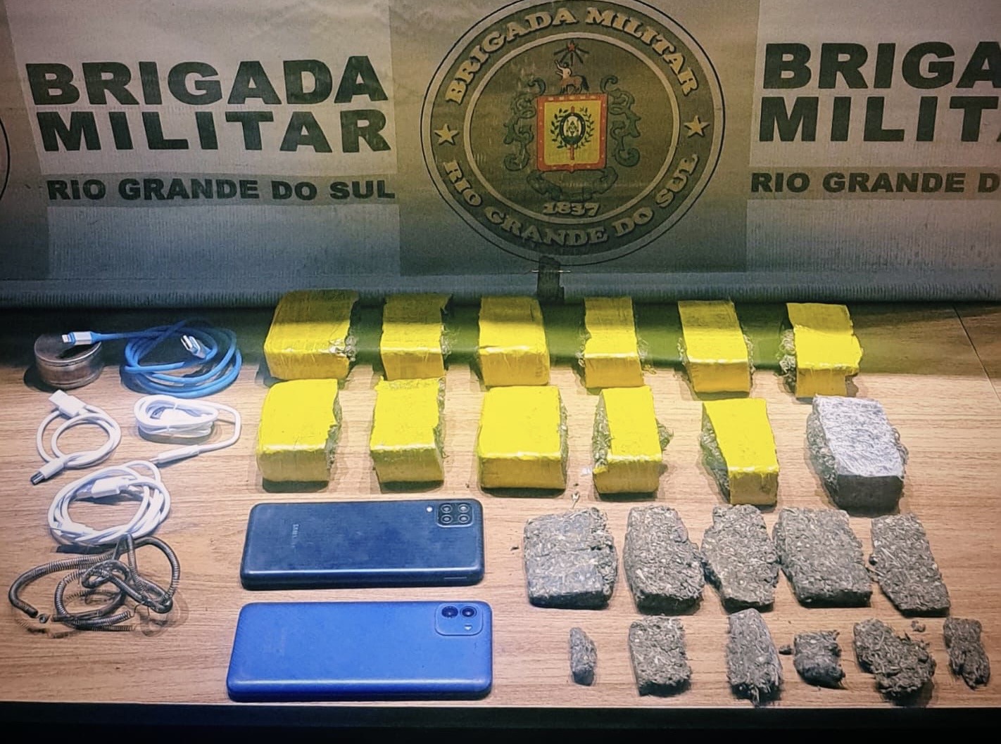 Durante a fuga, o homem dispensou uma mochila contendo 1,364 kg de maconha, fracionada em 12 porções, além de cabos de carregador de celular e uma resistência de chuveiro, materiais comumente utilizados para arremessar entorpecentes ao interior da penitenciária.