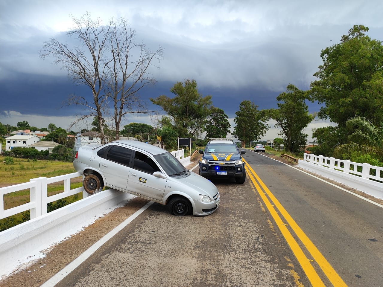 O carro seguia no sentido Santiago–Jaguari quando, por motivos ainda desconhecidos, atingiu a estrutura e acabou preso sobre a guarda de proteção da rodovia.
