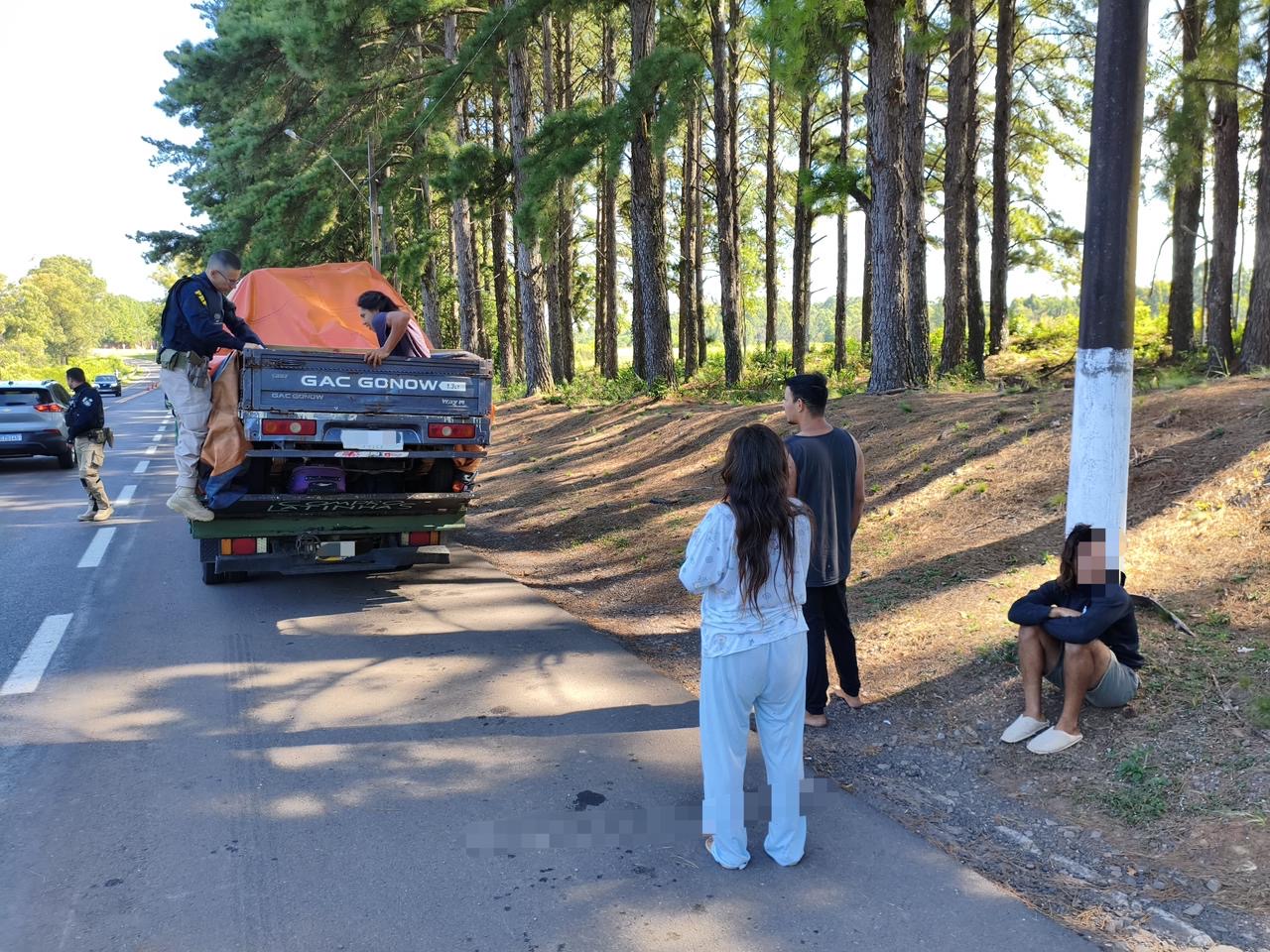 A fiscalização focada no funcionamento dos sistemas de freios dos veículos de carga resultou na identificação de um caminhão GAC, emplacado no Chile, que transportava, além de uma caminhonete na caçamba, três pessoas escondidas embaixo da lona da carga. As vítimas, que haviam saído de Florianópolis, onde trabalham com reciclagem de latinhas, estavam a caminho do Chile, seu destino final.