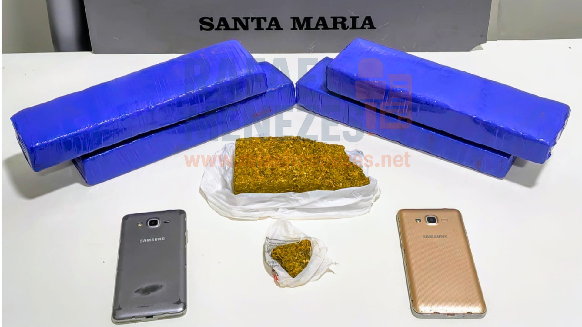 Durante a revista, os policiais encontraram dentro da mochila quatro tijolos de maconha, totalizando 2.616 gramas, além de duas porções da mesma droga, que somaram 344 gramas. Também foram apreendidos dois celulares da marca Samsung.