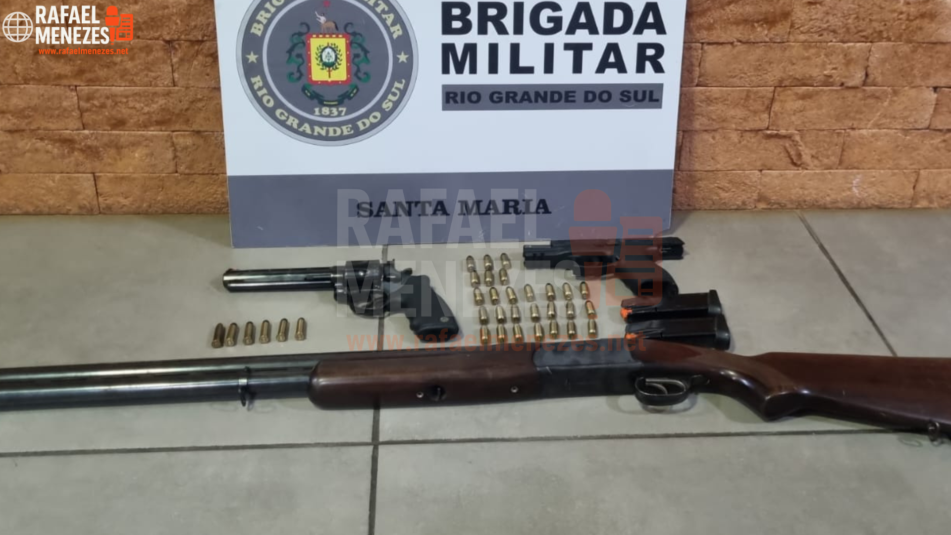 Na residência foram apreendidos um revólver calibre .38, uma pistola calibre .40 com numeração suprimida, uma espingarda calibre 12, além de 33 munições de diferentes calibres.