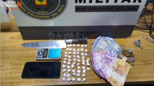 Um homem de 43 anos foi preso por tráfico de drogas na noite deste sábado (11), na Rua Vermelha, no bairro Noal, em Santa Maria. De acordo com a Brigada Militar, a prisão ocorreu durante policiamento ostensivo na região, quando os policiais visualizaram uma movimentação suspeita envolvendo três indivíduos. Ao perceber a aproximação da viatura, um deles dispensou ao solo uma bucha de cocaína.