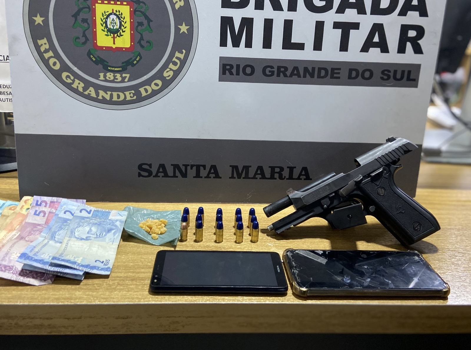 Após ser abordado e contido, os policiais localizaram o objeto dispensado, um pote de cor rosa, que continha uma porção de crack. Com o homem também foram apreendidos R$ 363 em dinheiro e uma mochila onde havia uma pistola calibre 9mm, carregada e municiada, além de munições de outros calibres. Em consulta, foi constatado que a arma possuía registro de furto.
