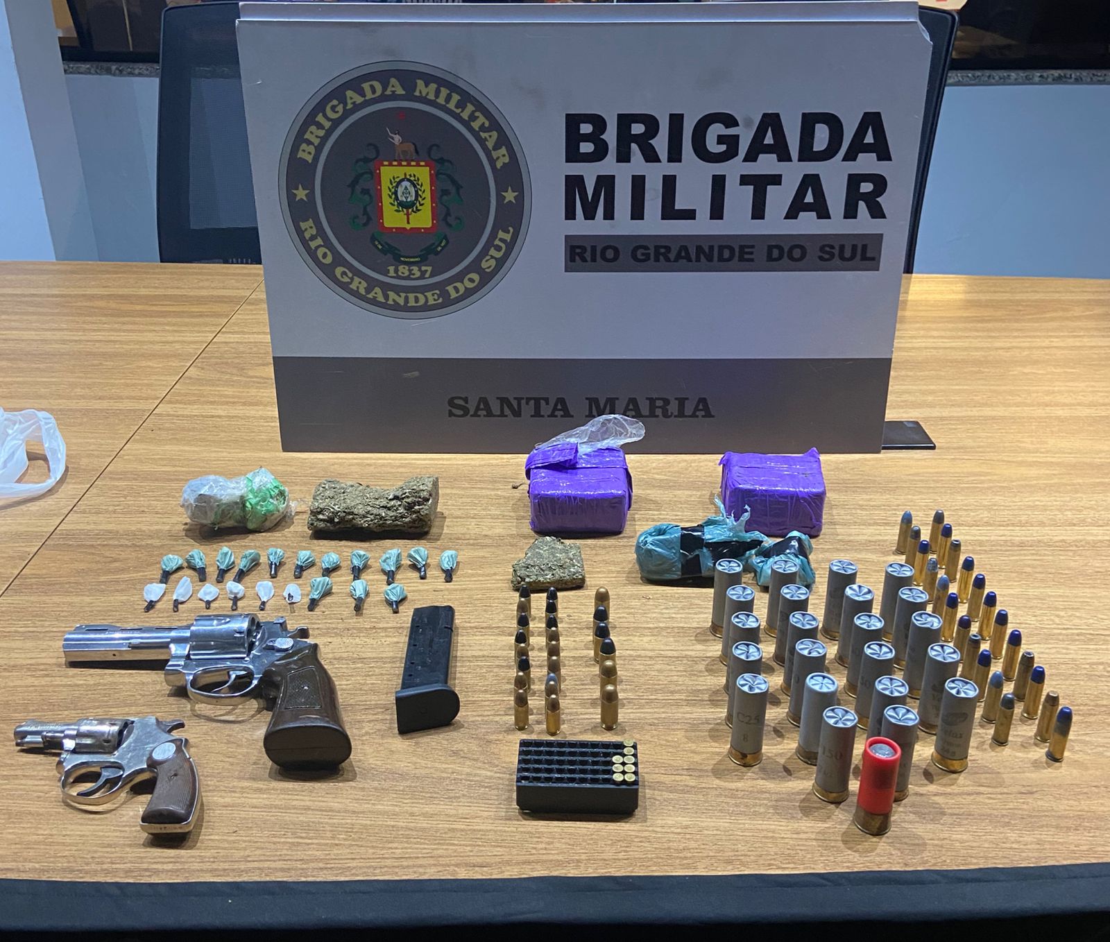 No local de onde o suspeito havia fugido, foi encontrado um revólver calibre 38 carregado. Em uma cadeira próxima, os policiais localizaram uma mochila com mais uma arma, munições de diversos calibres e porções de maconha, cocaína e crack, todas prontas para a comercialização.