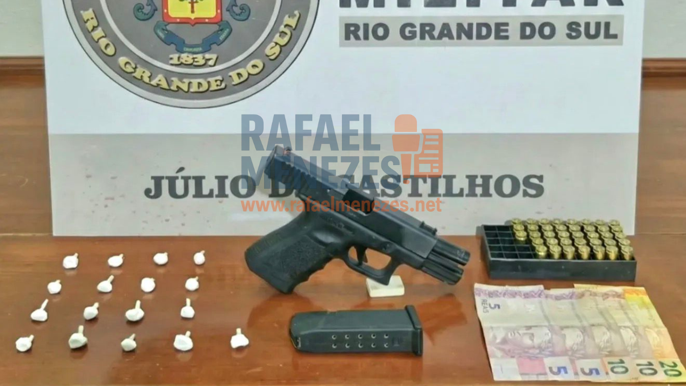 Um jovem de 19 anos foi preso por volta das 21h15min de sábado (7), na rua Coronel Luiz Azevedo, no bairro Pedreira, em Júlio de Castilhos, por porte ilegal de arma de fogo de uso restrito e tráfico de drogas.