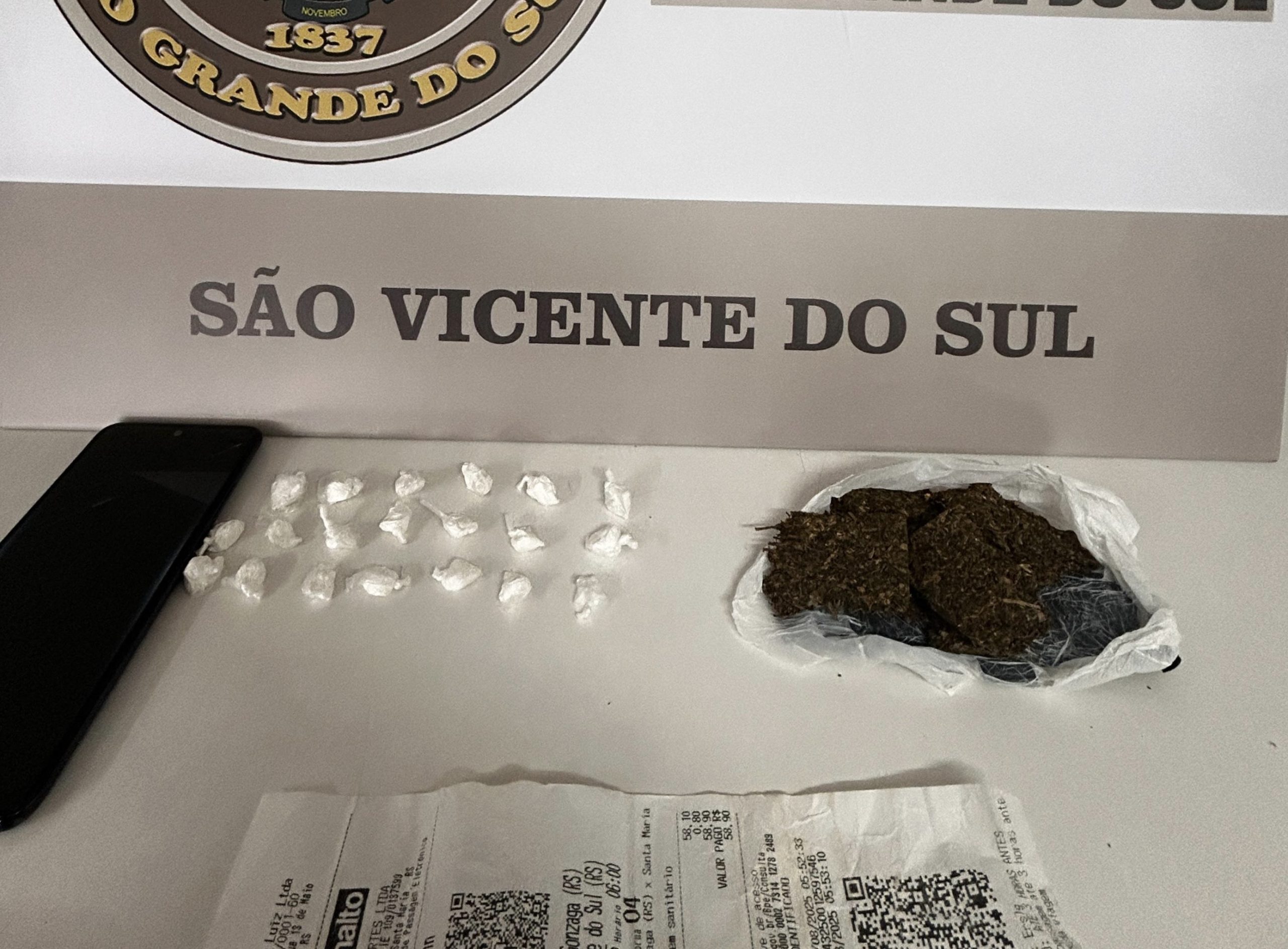 Um jovem de 25 anos foi preso na manhã desta segunda-feira (4) pelo crime de tráfico de drogas em São Vicente do Sul. A ação foi realizada pela Brigada Militar após a guarnição receber informações sobre um indivíduo suspeito que teria embarcado em São Luiz Gonzaga em um ônibus com destino ao município.