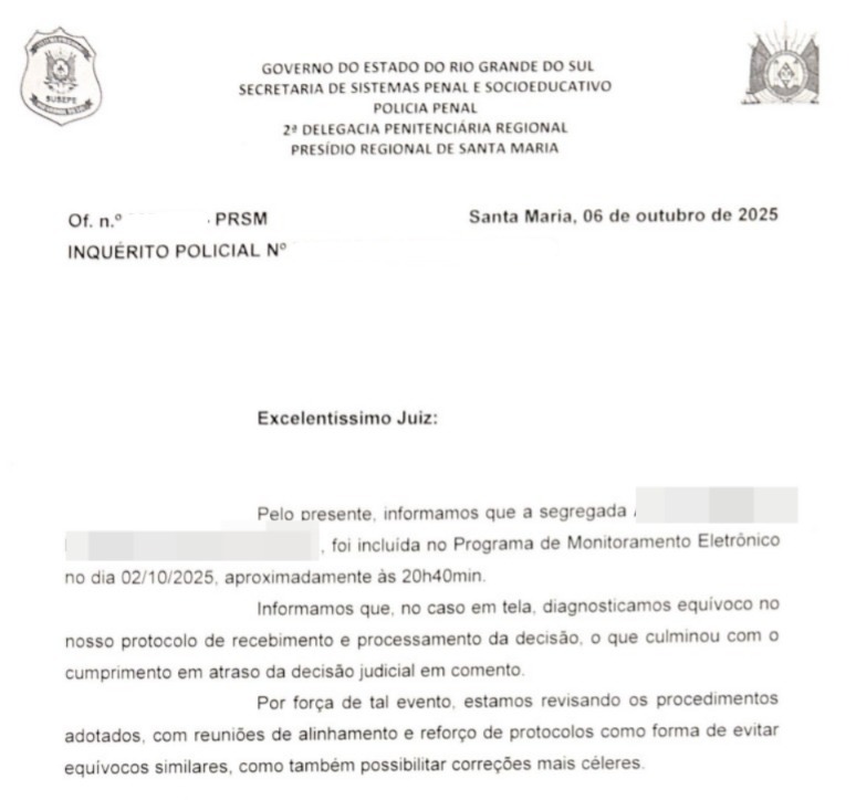O documento emitido pelo Presídio Regional de Santa Maria, datado de 6 de outubro de 2025, confirma que houve um erro interno no protocolo de recebimento e processamento da decisão judicial que concedia liberdade à mulher. O texto informa que ela foi incluída no Programa de Monitoramento Eletrônico apenas no dia 2 de outubro, às 20h40min, reconhecendo, portanto, o atraso no cumprimento da ordem judicial.
