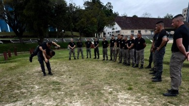 O curso aborda preparo físico, fisiologia, primeiros socorros, direitos humanos e técnicas de contenção, imobilização e algemação, com carga de 12 horas diárias durante 26 dias.