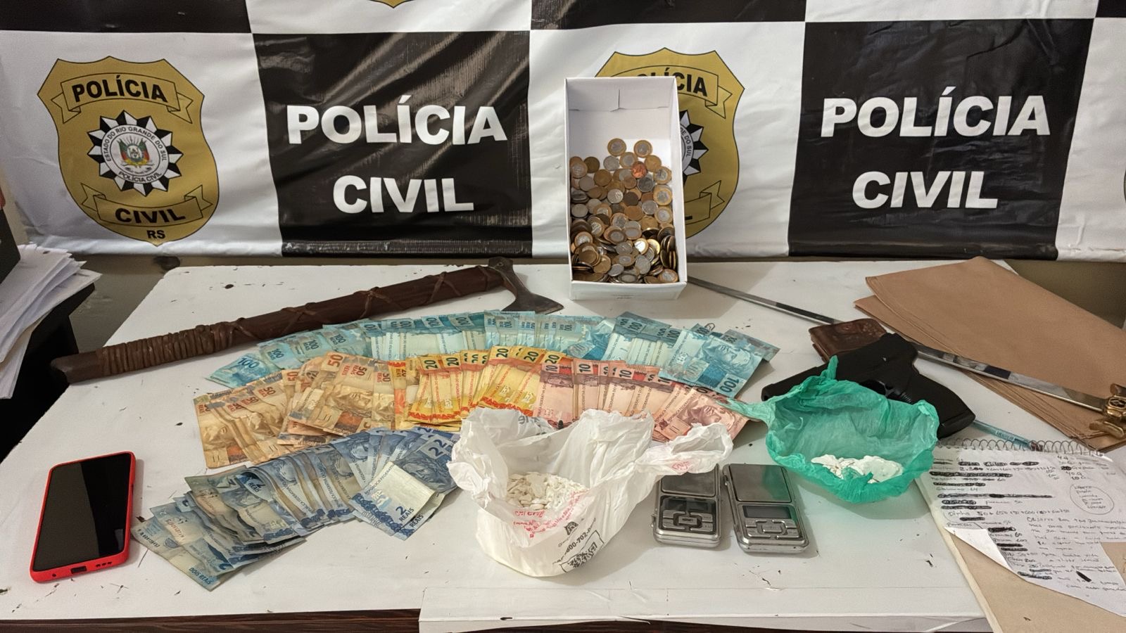 Com o apoio da Brigada Militar, a ação resultou na apreensão de aproximadamente 200 gramas de cocaína, mais de R$ 6.000,00 em dinheiro, munições, balanças de precisão, aparelhos celulares e outros materiais relacionados ao tráfico de drogas. No momento da abordagem, o homem foi detido pelos crimes de tráfico de drogas e porte ilegal de munição, sendo conduzido à Delegacia de Polícia.