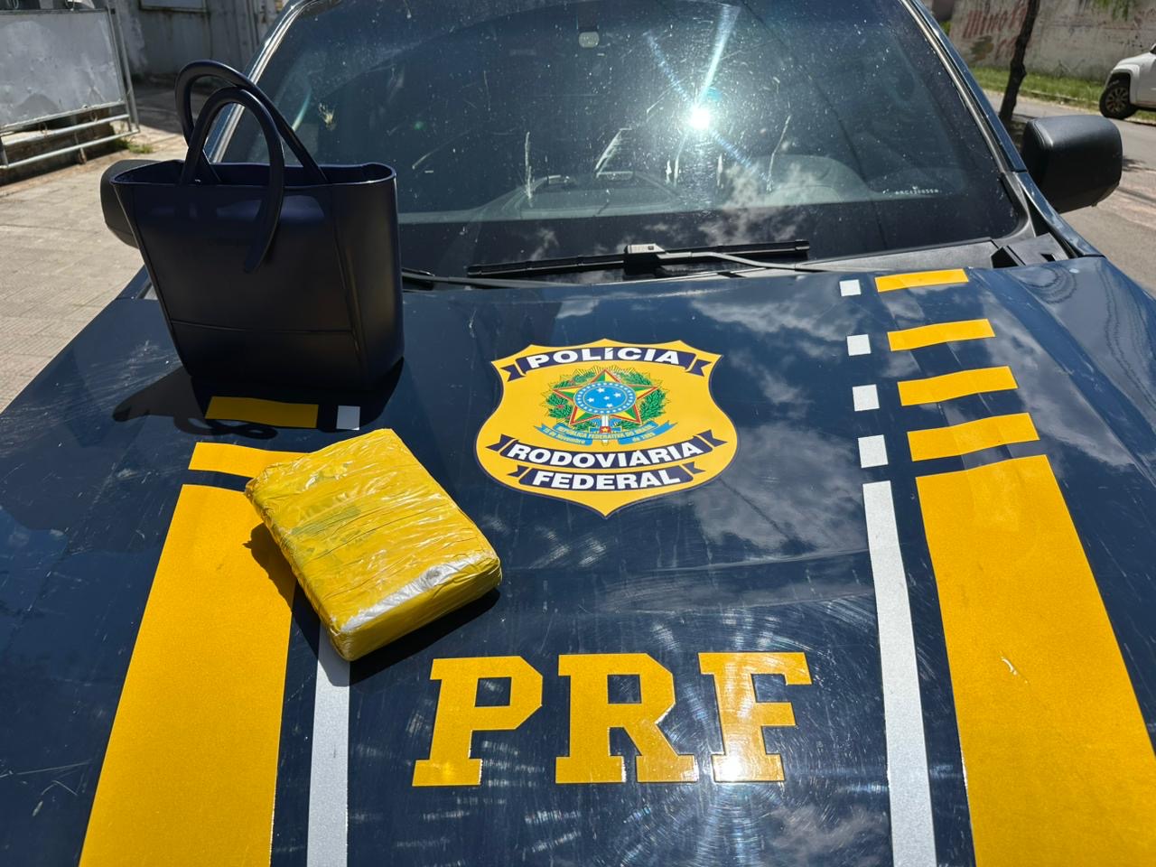 Durante a vistoria, os agentes encontraram um tablete de cocaína escondido na bolsa de uma das passageiras. O produto seria o suficiente para render mais de mil porções, após fracionado.