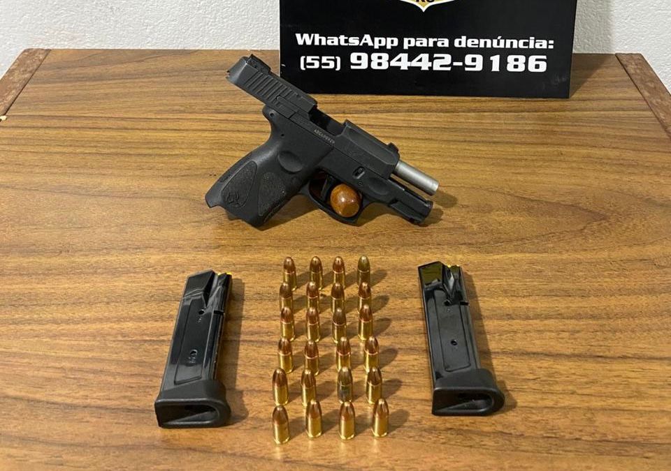 Durante buscas no endereço da família, os policiais localizaram uma pistola G2c 9mm, dois carregadores com 24 munições, sendo constatado que a arma era furtada em 2024, na localidade do Tupanci, interior da cidade.
