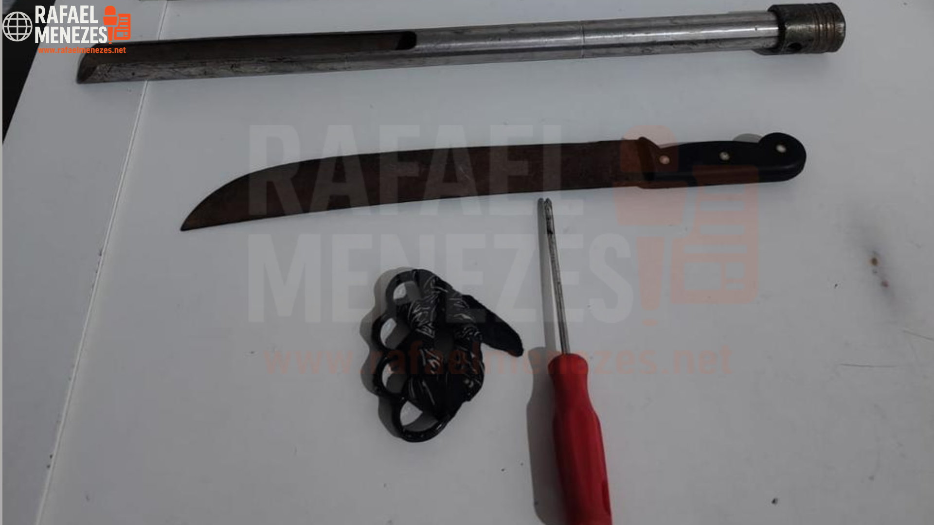 Com os suspeitos, os policiais localizaram uma soqueira, uma barra de ferro, um facão e uma chave Philips.