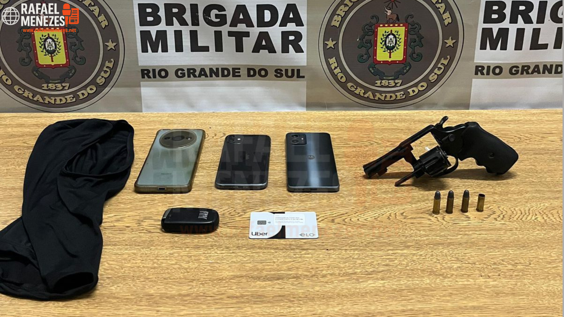 Durante a ocorrência, os policiais apreenderam: um revólver calibre 32, três munições intactas e uma deflagrada, três aparelhos celulares, uma touca ninja e um veículo Fiat Fastback